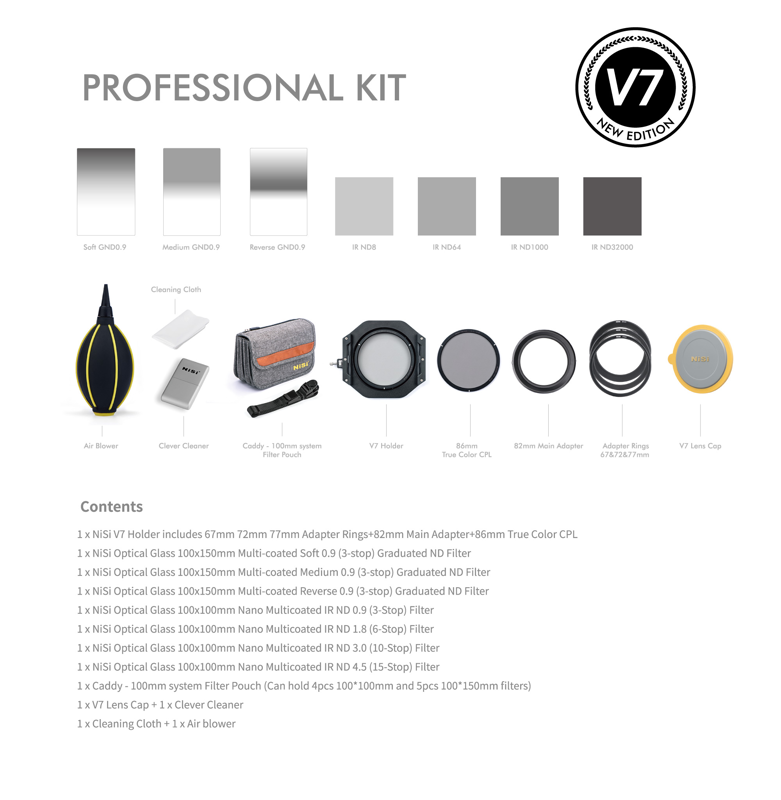 NiSi Professional Kit 100mm System V7 sisaldab: 1x NiSi 100mm alumiiniumist filtrihoidja komplekt V7 koos adapterrõngastega 67mm, 72mm, 77mm ja 82mm jaoks. 1x True Color CPL filter 1x NiSi 100x100mm Nano IR neutraalne tihedusfilter ND8 (0.9) 3 stoppi 1x NiSi 100x100mm Nano IR neutraalse tihedusega filter ND64 (1,8) 6 stoppi 1x NiSi 100x100mm Nano IR neutraalne tihedusfilter ND1000 (3,0) 10 stoppi 1x NiSi 100x100mm Nano IR neutraalse tihedusega filter ND32000 (4,5) 15 stoppi 1x NiSi 100x150mm Nano IR pehme gradueeritud neutraalse tihedusega filter ND8 (0,9) 3 stoppi. 1x NiSi 100x150mm Nano IR keskmise astmestikuga neutraalse tihedusega filter ND8 (0,9) 3 stopp. 1x NiSi 100x150mm Nano IR tagurpidi gradueeritud neutraalse tiheduse filter ND8 (0,9) 3 stoppi 1x NiSi Filter Pouch Caddy Pro100 V7 hoidikule ja kuni 8tk Nisi 100x100mm / 100x150mm filtritele. 1x V7 objektiivi kork 1x Puhastuslapp 1x NiSi õhupuhur 1x NiSi Clever Cleaner