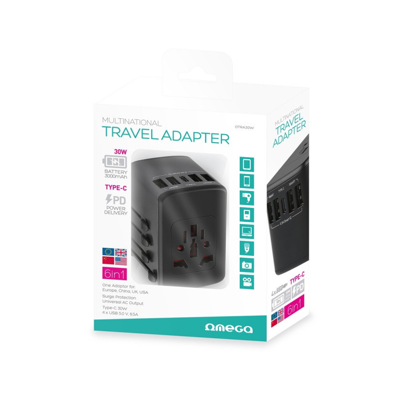 > Omega reisiadapter 6in1 USB must (45308)
