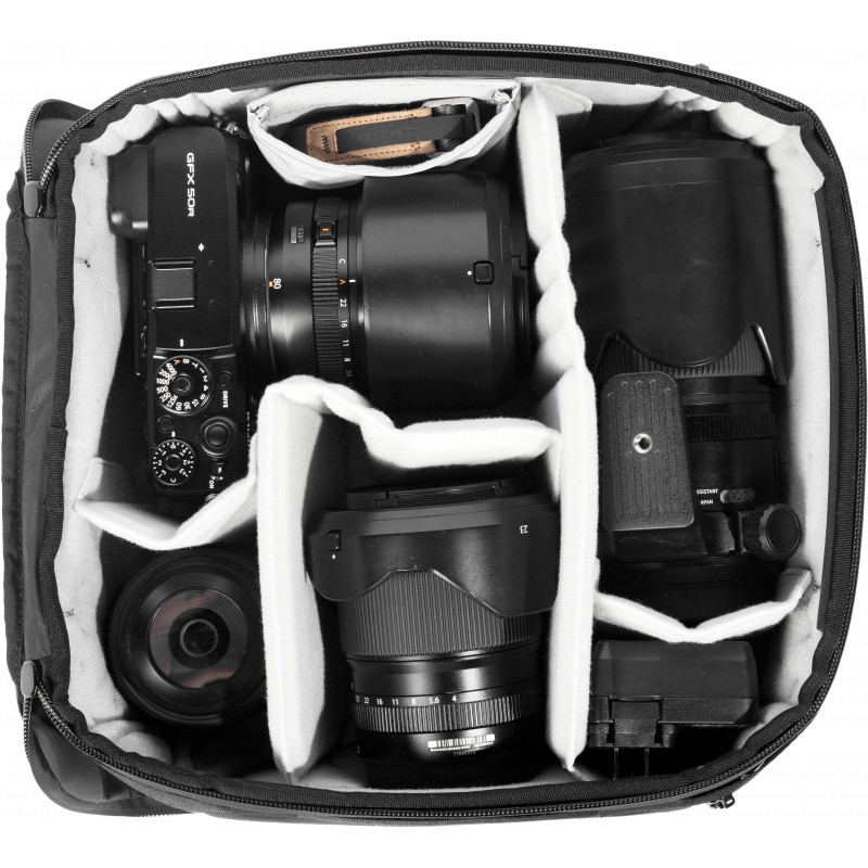 FlexFold vaheseinad võimaldavad kohandatavat organiseerimist ja kaitset. Maksimaalse mahutavuse saavutamiseks aseta esemed vertikaalselt virna. Ujuv tasku on mõeldud objektiivikorgi, filtri ja muude väikeste esemete jaoks.Mugav kaasaskandmine