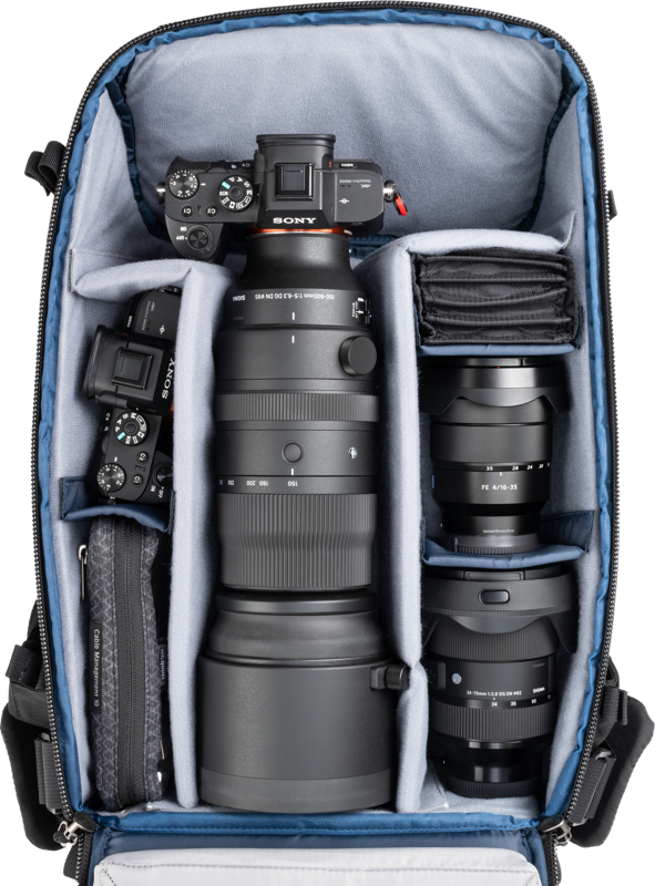 Reguleeritavad vaheseinad võimaldavad kohandada kotti vastavalt suurtele teleobjektiividele, tavapärasele fotovarustusele või isiklikele esemetele